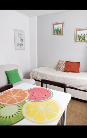 Dos ambientes: cocina separada y equipada, baño, habitación con cama matrimonial, living con sillón cama y cama individual.