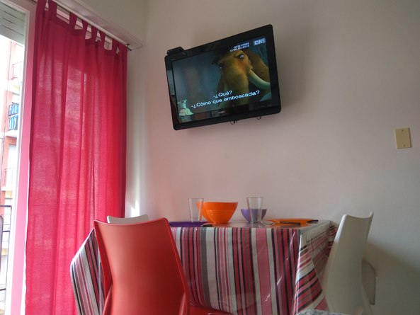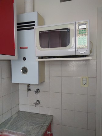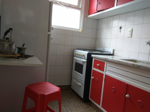 Cocina con microondas, heladera con freezer, mesita desayunadora, vajilla completa.