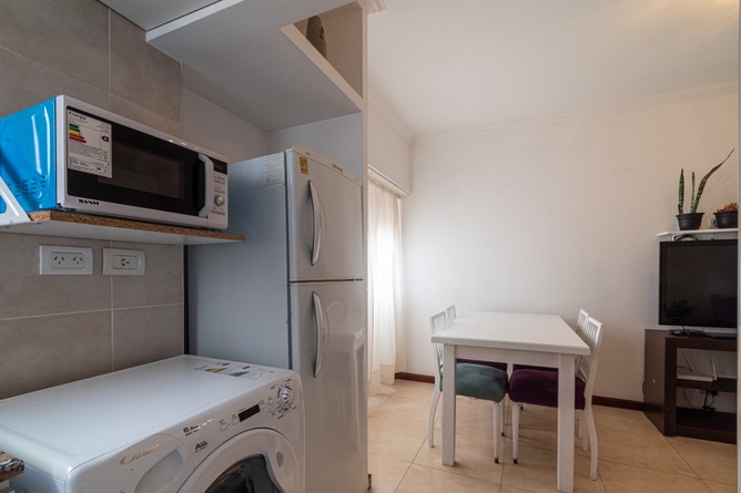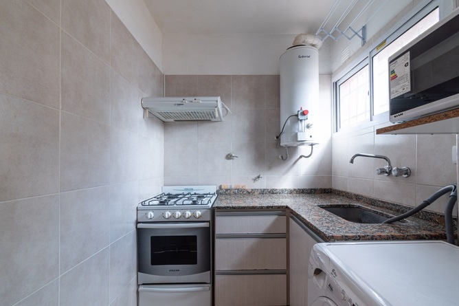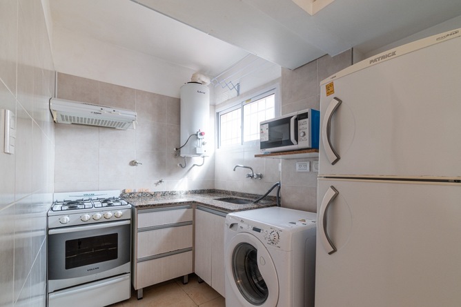 Cocina equipada, microondas, pava eléctrica, licuadora, lavarropas, heladera con freezer, horno.