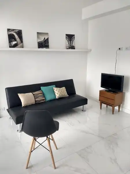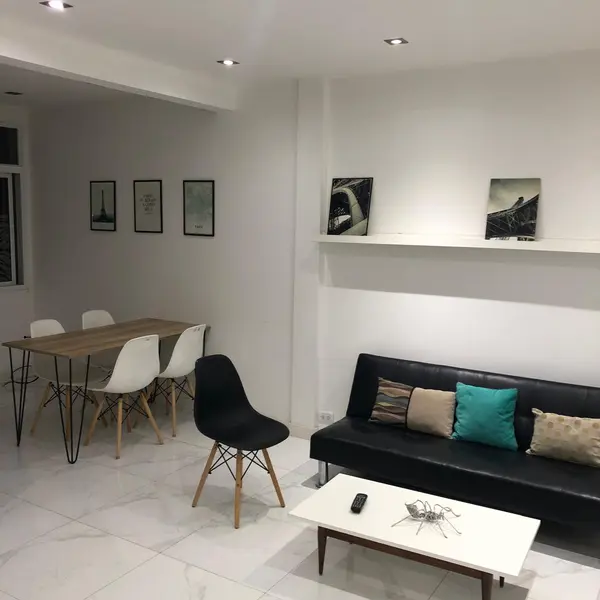 Este moderno departamento esta recientemente reciclado, tiene tres ambientes, tiene vistas a la plaza Mitre, y en el comedor se ve de lejos el mar, se encuentra a cuatro cuadras de la peatonal San Martin y a nueve cuadras de las playas Alfonsina y lo mismo de playas del Casino. Tiene dos dormitorios, consta de somier y colchón nuevo en la habitación ppal y dos camas simples en la otra, tiene equipamiento completo de cocina, pava eléctrica, microondas, TV color , un ventilador y muebles modernos de living y comedor .