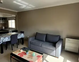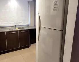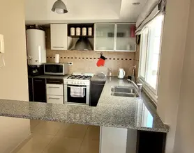Cocina semi incorporada equipada con vajilla completa, cocina con horno, heladera con freezer y microondas.