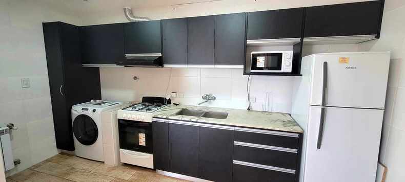 Cocina totalmente equipada: heladera con freezer, microondas, lavarropas automático y vajilla completa