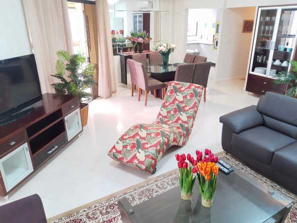 El departamento cuenta con cuatro habitaciones, dos en suite con baño, baño social, sala comedor totalmente equipada, cocina, área de servicio con lavadora, balcón con barbacoa, dos plazas de aparcamiento. Aire acondicionado en todos las dependencias y televisores en todas las habitaciones.