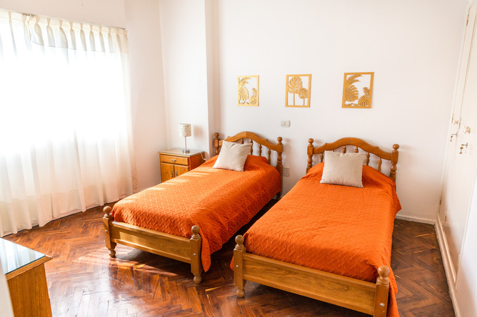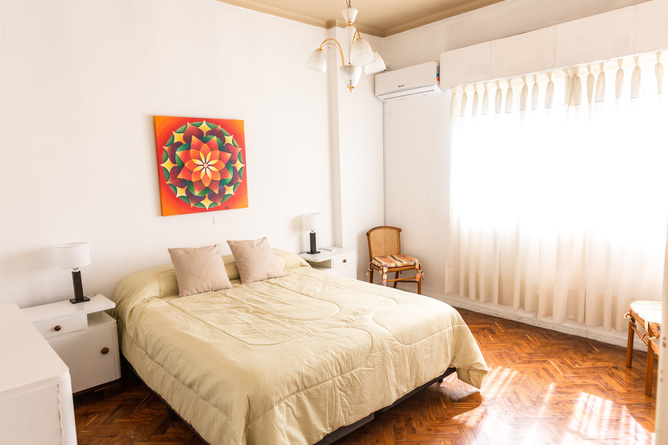Amplio y luminoso departamento en 2º piso (100m2). Ubicado en pleno centro de Mendoza a 6 cuadras de la peatonal y a 10 cuadras de la avenida Arístides Villanueva. Cuenta con un amplio living-comedor, 2 habitaciones (una con cama matrimonial y otra con 2 camas individuales), baño completo y baño de invitados. Cocina equipada con todo lo que necesitas para tu estadía. Incluye cochera cubierta para todo tipo de vehículos.