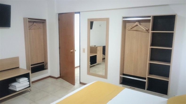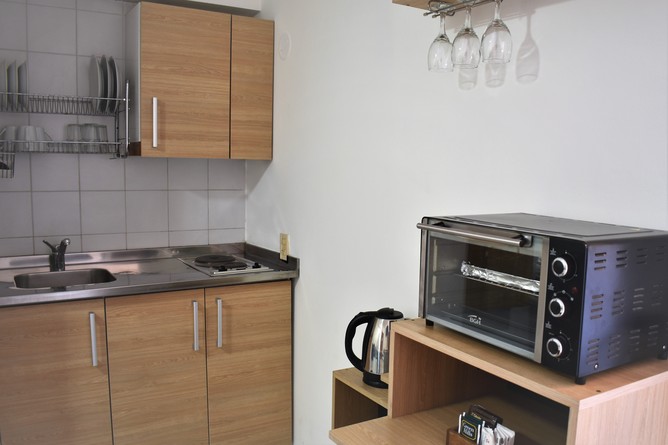 Apartamentos de 2 ambientes en 40 m2 distribuidos en área de estar y de dormir. WiFi en todo el apartamento. Un dormitorio con cama tamaño Queen box spring (Sommier 165 de ancho), pantalla LED de 39" y aire acondicionado. Área de estar con pequeña cocina integrada (kitchenette) equipada con hervidor, horno electrico, selección de té y refrigerador. Un baño completo con ducha y bañera, inodoro y bidet.