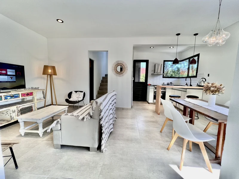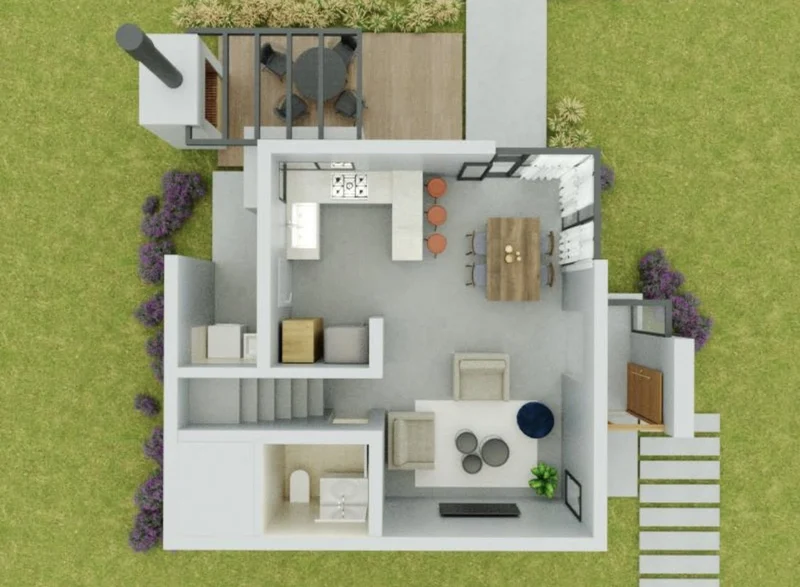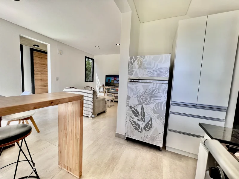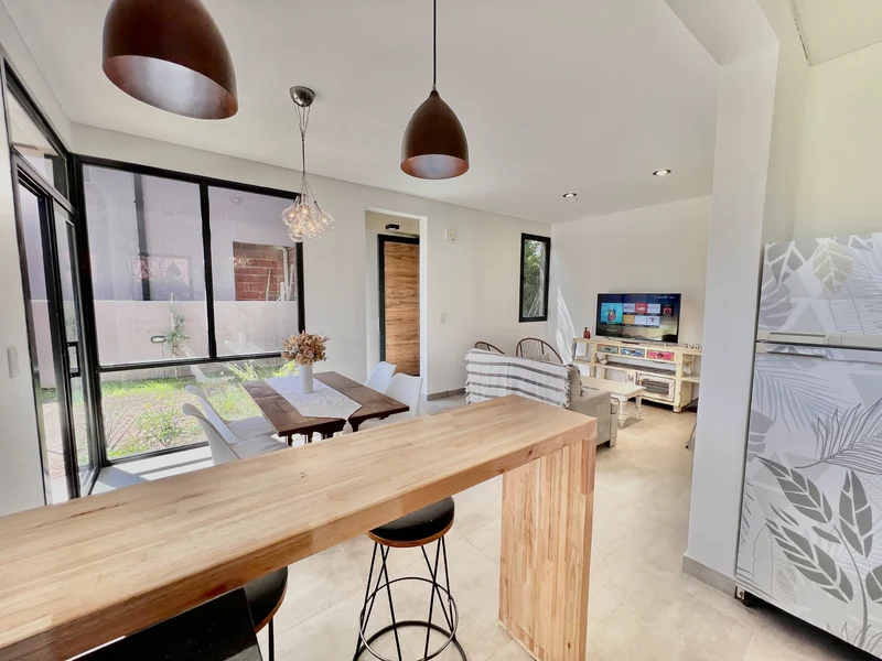 90 mts. cubiertos en dos plantas, en planta baja living comedor y cocina totalmente equipada. Cocina con horno. Heladera con freezer. Pava eléctrica, vajilla completa.