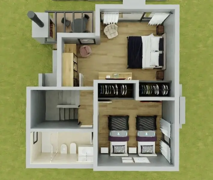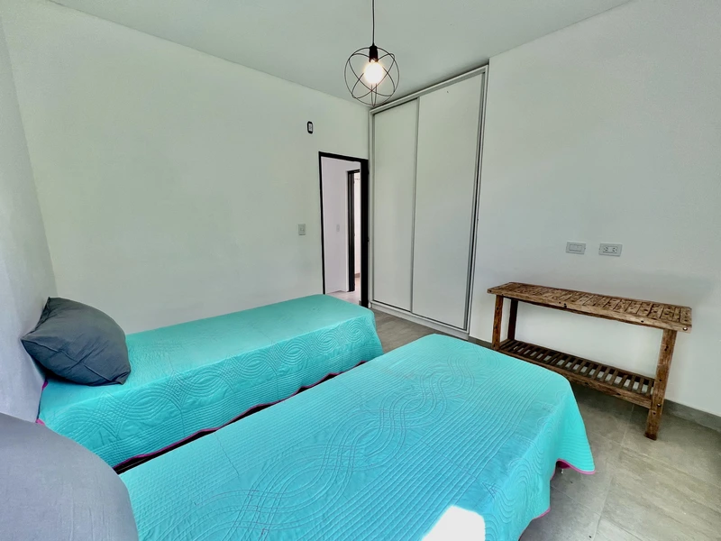 En planta alta Dos dormitorios y un segundo baño con ducha. El dormitorio matrimonial principal cuenta con una vista realmente increíble a las sierras, es muy amplio y cuenta con un sillón, Sommier Suavestar de 1,60 con pillow y amplios placard. El segundo dormitorio cuenta con dos camas sommier individuales (se pueden hacer matrimonial) y amplio placard.