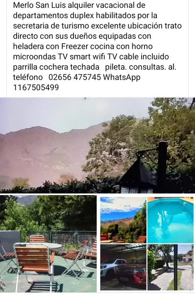 Alquiler de departamentos en Merlo San Luis, habilitados x la secretaria de turismo de la municipalidad de Merlo San Luis ,excelente ubicación sobre avd principal, a media cuadra del balneario Rincon del este de Merlo, amoblados y equipados, parrilla ,cochera techada,piscina , somniers TV smart, microondas , cocina con horno, heladera con Freezer ,wifi , TV cable incluido ,terraza con vista a las sierras ,el precio publicado varía dependiendo la fecha y cantidad de personas ,consultas al teléfono[utilice el form. o tel. de contacto]WhatsApp[utilice el form. o tel. de contacto]