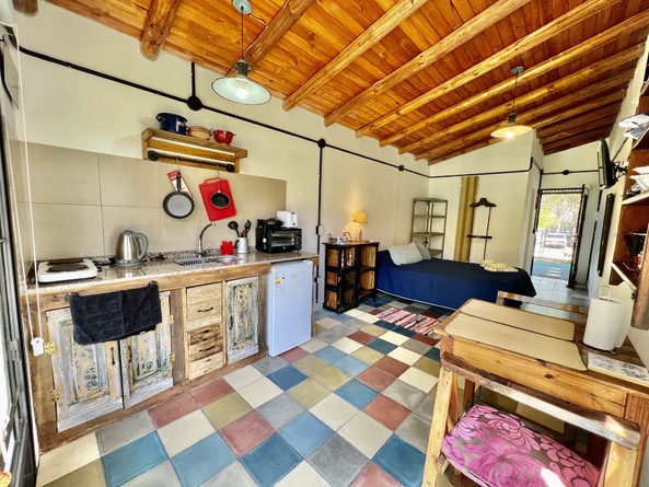Cocina equipada con anafe eléctrico de 2 hornallas, horno eléctrico, pava eléctrica, tostadora, sandwichera, heladera bajomesada, vajilla completa.