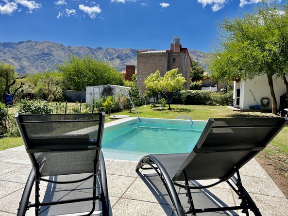 Piscina de 3 x 6 mts, x 1,45 de profundidad, con area de solarium húmedo, sin cerco perimetral. Reposeras y mesas de jardín. Ducha exterior para piscina.