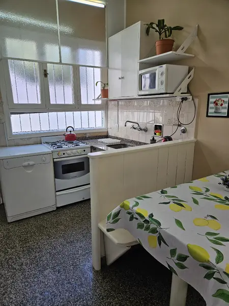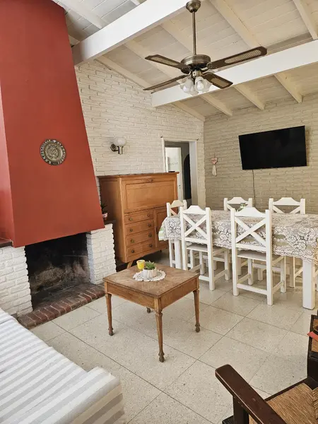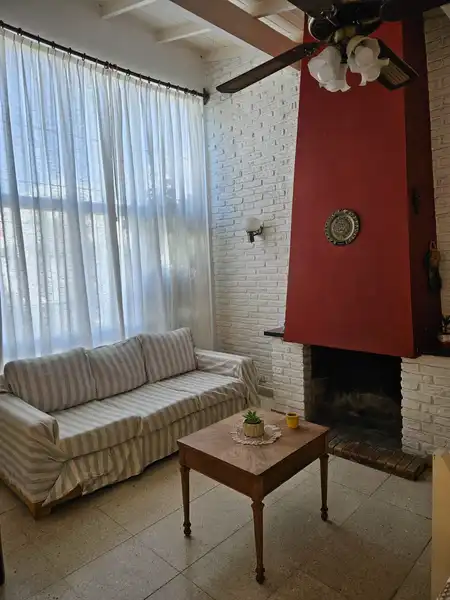 Posee tres dormitorios, dos de ellos con cama matrimonial (ambas con sommier) y un tercer dormitorio con cama marinera (para dos personas). Dos baños, uno de ellos en suite en una de las habitaciones. Comfortable y calido living-comedor. El mismo se comunica mediante puertas corredizas al garage/quincho con parrilla. Patio trasero y lavadero cerrado. Tiene heladera con freezer, lavarropas automático, cocina con horno, horno microondas y pava eléctrica. Ademas, cuenta con alarma, rejas, Smart TV con cable y Wi-Fi (Fibra óptica de 300mb simétricos).