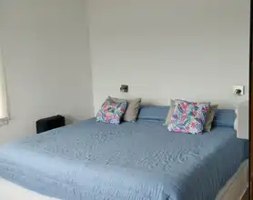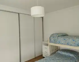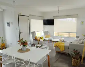 Casa de 80 m2 cubiertos en dos plantas: planta alta con baño completo y dos habitaciones luminosas c/ placard. Habitación doble: cama king size, ventilador de techo, escritorio; habitación simple con 3 camas de 1 plaza, aire acondicionado frío/calor y escritorio. Planta baja con cocina, barra pasante y amplio living comedor con vista al parque. Comedor diario con mesa y seis sillas; living con sofá de tres cuerpos y dos de un cuerpo. Muchas ventanas y luz natural. Aire acondicionado frío/calor. Baño luminoso y cómodo.