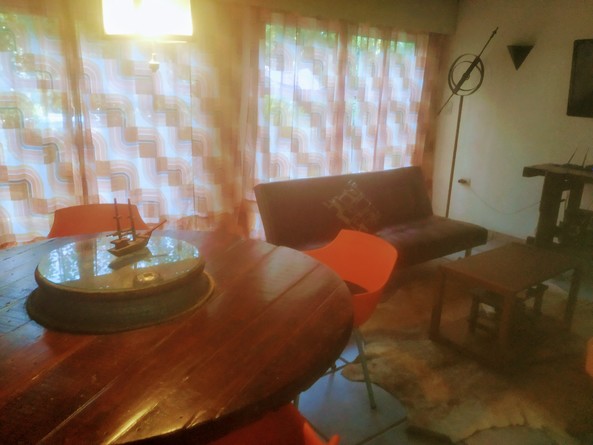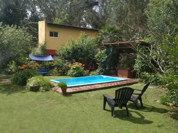 Amplio jardín con pileta de 5x2,5x1,20(sin valla de seguridad), amplio parque con ornamentales y frutales.La pileta se comparte con la propiedad de al lado cómo en las cabañas.