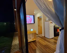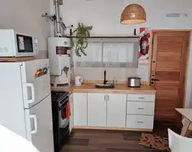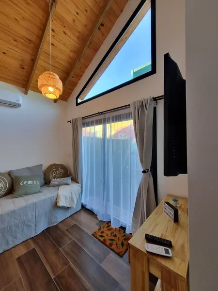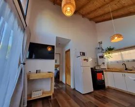 Living y cocina: Un espacio cálido y luminoso donde relajarte, mirar TV o compartir una comida casera. La cocina está equipada para que la disfrutes con microondas, horno, tostadora, pava eléctrica, vajilla completa, copas y todos los elementos necesarios para que solo tengas que pensar en cuál será el menú.