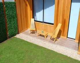 Deck con sillas y mesa de exterior, parrilla, parque individual y privado