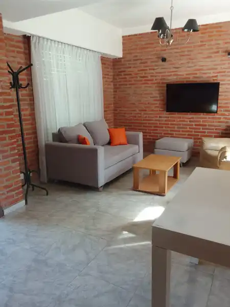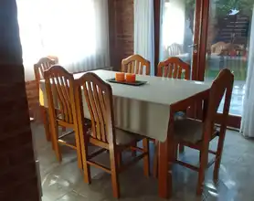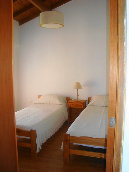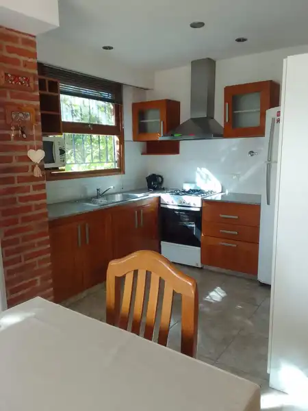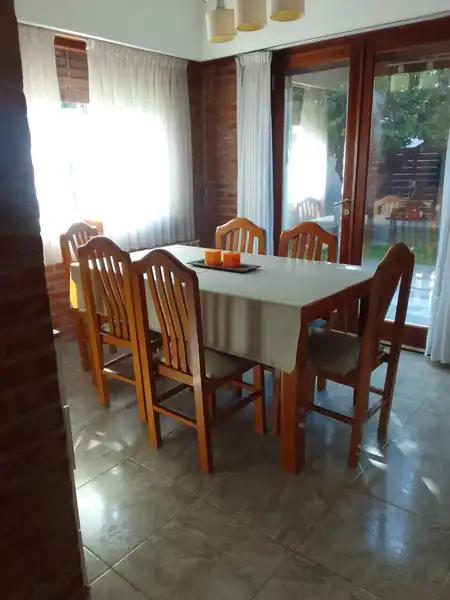 Chalet de dos plantas. A 10 cuadras de la playa, 6 peatonal. PB: cocina compl., microondas, helad no frost, lav aut, comedor, living c/cable, wifi, Toil., entr. auto, parque frutales y parrilla. En PA: 2 dorm, hall, baño ppal. Compart. Alarma X28