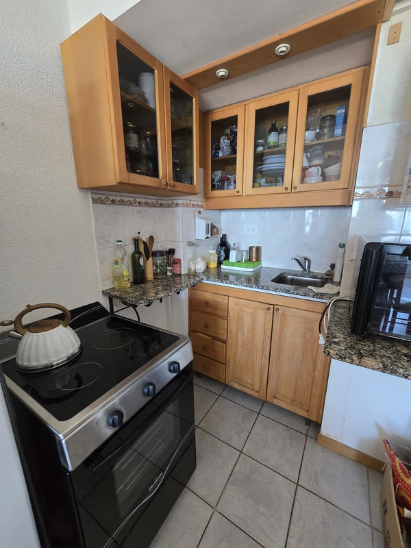 Cocina eléctrica equipada con heladera con freezer, horno, y vajilla completa.