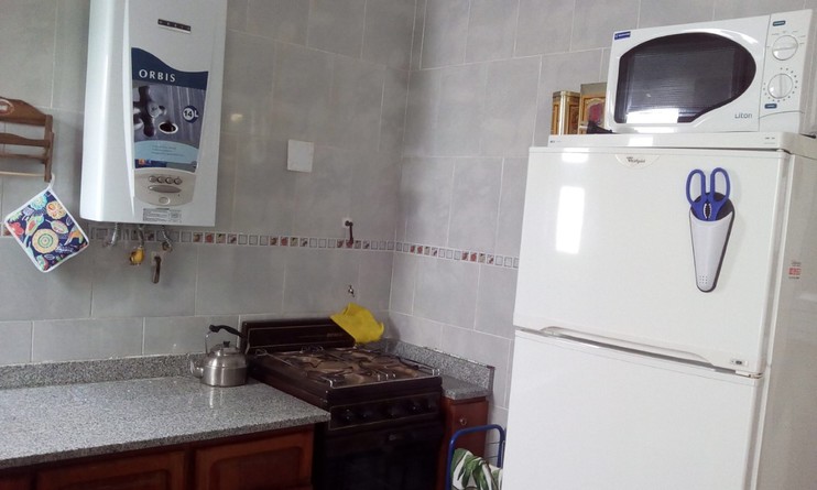 Cocina, equipada con microondas, heladera con freezer, horno eléctrico.