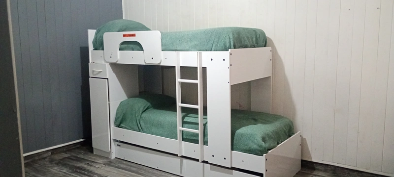 Tiene 2 habitaciones una cama matrimonial con tv smart (youtube/Netflix ) y la otra cama cucheta con otra cama mas abajo!!