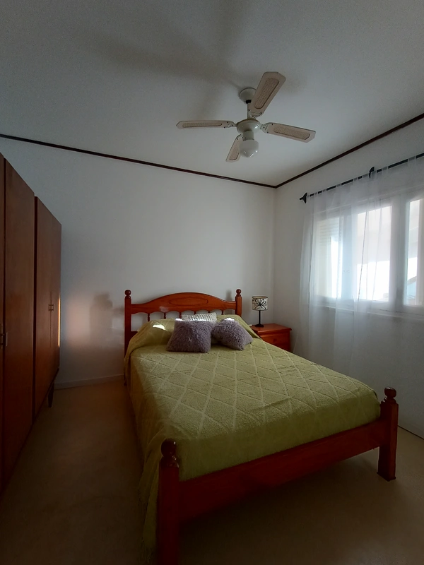 - Habitación principal con cama matrimonial y ventilador de techo.