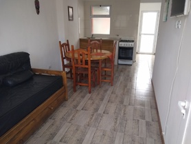 Alquilo departamento para cuatro personas. Todos los servicios. A 10 cuadras de la playa, 15 de la peatonal y 15 del centro viejo. Una habitación con cama matrimonial y tv. En el living hay otra cama marinera con cama carrito abajo, tv Smart, wifi y cable, ventilador. Patio con parrilla. Heladera con freezer, cocina, horno, vajilla completa