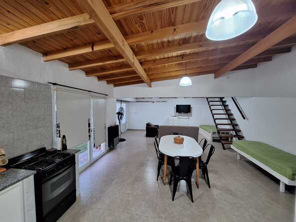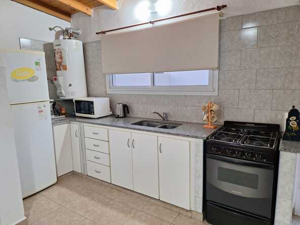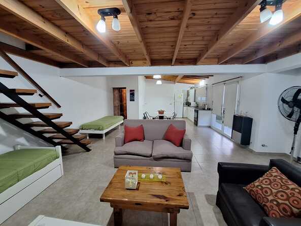 Duplex equipado hasta 4/5 personas personas, con horno microondas, heladera con freezer, tostadora, pava eléctrica, cafetera, tv de 40' con Netflix, Flow, WIFI, mosquiteros en todas las aberturas, dormitorio matrimonial en planta alta con aire acondicionado y sommier, 2 camas de una plaza en planta baja, gran patio de 300 m2 .