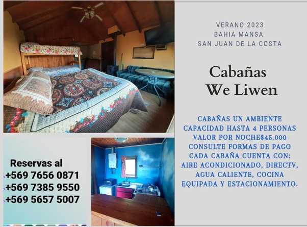 4 Cabañas de un ambiente equipadas y 1 de 8 personas para tus vacaciones en familia o una escapada romantica a la playa en Bahia Mansa, vista al mar, agua caliente, TV cable, estacionamiento privado, aire acondicionado entre otros servicios.