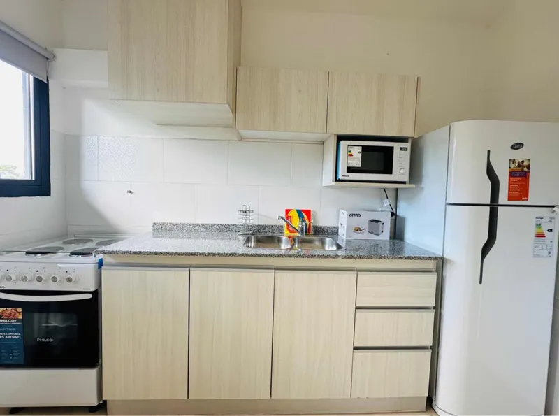 Cocina equipada con heladera c/freezer, pava eléctrica, microondas, tostadora.