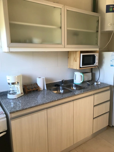 El duplex se encuentra con una cocina equipada con pava eléctrica, tostadora, microondas, cafetera y heladera c/freezer.