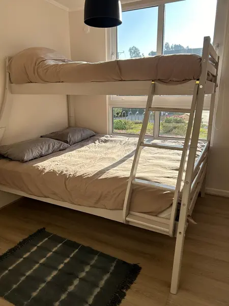 Hermoso Departamento habilitado para 4 a 6 personas, dos dormitorios (dormitorio 1 cama matrimonial, dormitorio 2 camarote con cama de dos plazas y arriba cama de una plaza y media y un futón) dos baños con tina, cocina y living comedor y hermosa terraza hacia jardines, quebrada y piscina.