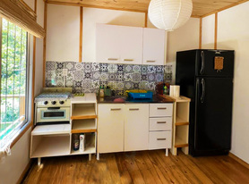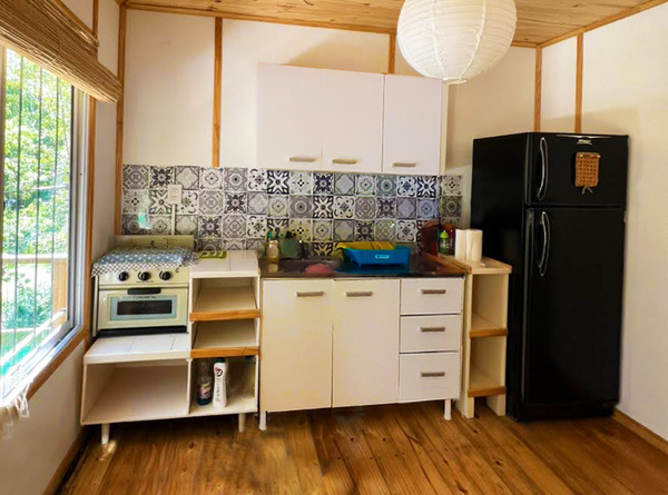 La cocina es a garrafa, tiene horno, heladera con freezer, juego completo de vajilla y enceres de cocina. Hay detergente y esponjita, sal, aceite y vinagre y un bidón de agua de 10 litros para cocinar y tomar mate, te o café.