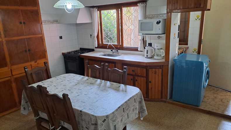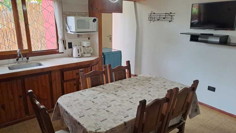 Equipado con: heladera con freezer, microondas, lavarrropas automático. Tv led 24 y 32´,Wifi. Ventiladores, calefactores TB, conexión a gas natural y cloaca. Vajilla completa. Mesa y sillas de jardín.