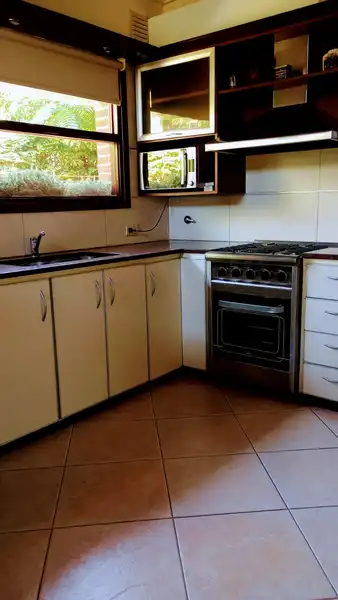 Es un amplia casa muy iluminada ubicada en el llamado barrio B5. Cerca del centro comercial y playa. Posee un amplio jardín,bordeado de un alto cerco perimetral verde con sector de deck parrilla y horno a leña