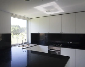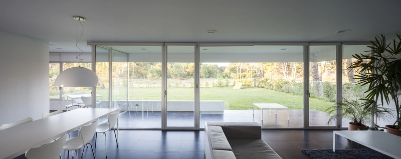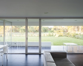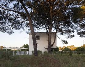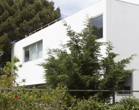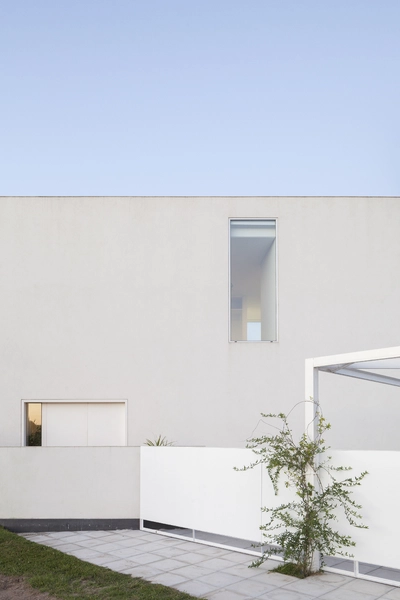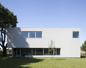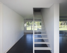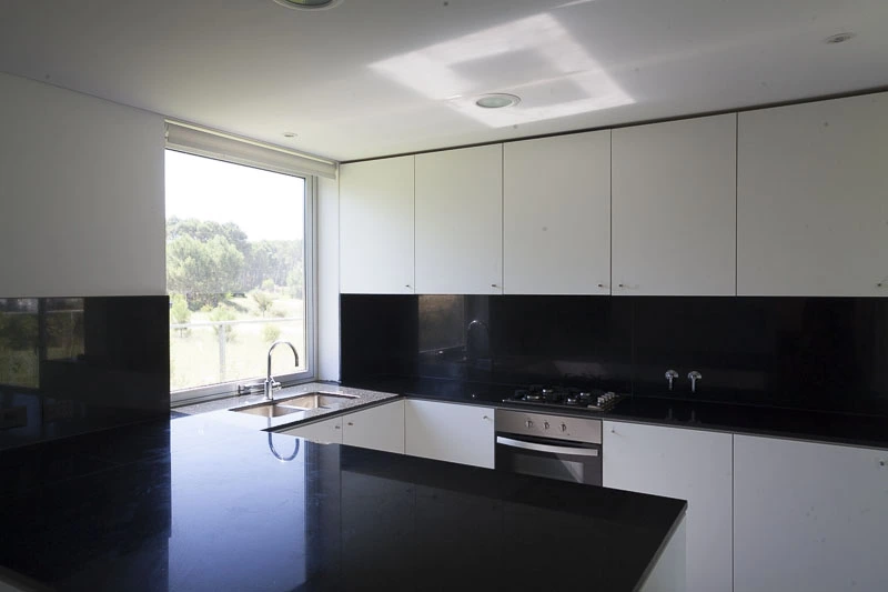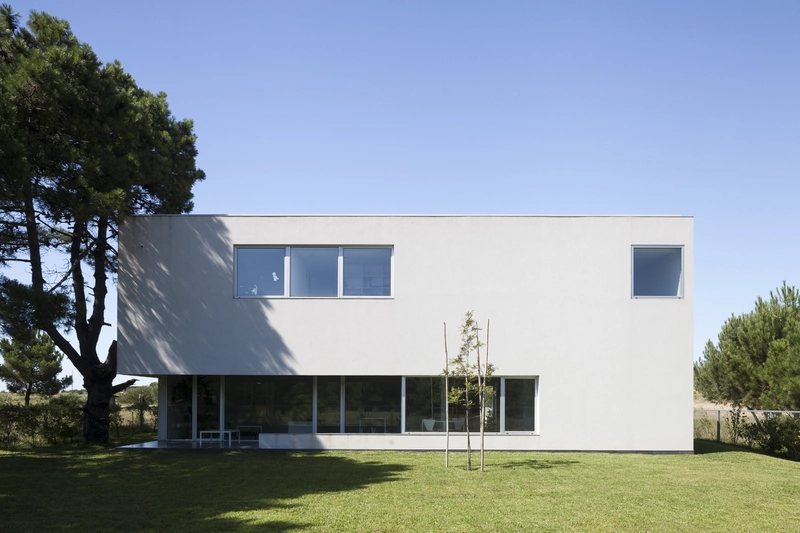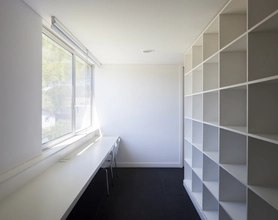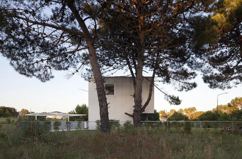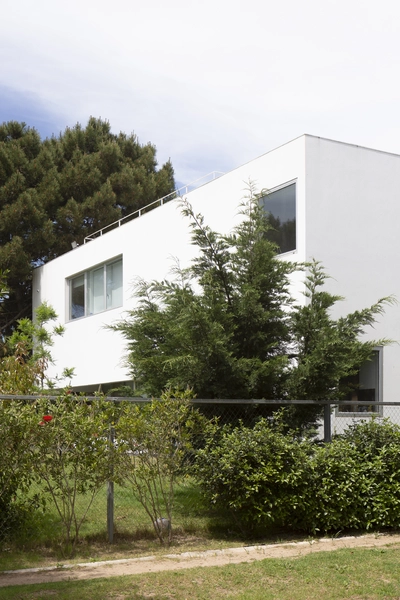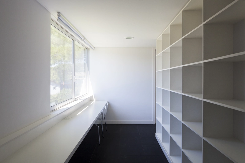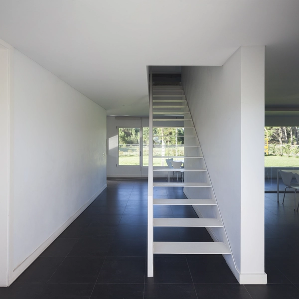 La planta se desarrolla longitudinalmente articulada a partir de un hall pasante. Un pequeño patio conduce desde el acceso descubierto al hall de la vivienda y la escalera. En torno a este espacio se disponen el estar-comedor y la cocina-lavadero-habitación de servicio, a cada lado. Los grandes paños vidriados se abren hacia las bandas de ventanas y la galería, a través de las cuales se vislumbra el entorno. El espacio interior se sostiene apoyando en un muro que delimita el comedor y el hall. También la planta primera se articula en torno a la escalera. Desde un distribuidor iluminado con la luz de un patio, se accede a los dormitorios que se orientan al este y al norte. Estos vuelan sobre la galería y presentan tamaños diferentes. En el lado sur se disponen los servicios.