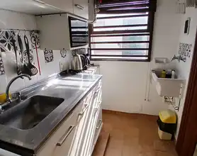 Cocina con heladera con freezer, cocina con horno, microondas, pava electrica, cafetera, tostadora.