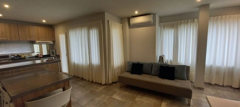 El dormitorio es en suite además posee un sofá cama en living. Cuenta con living comedor y cocina integrada en espacio abierto. Patio con parrilla y cochera cubierta, además de estacionamiento de cortesía al frente del edificio.