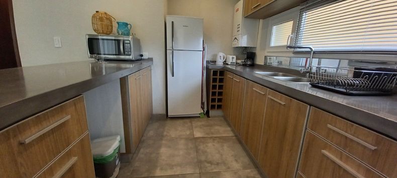 heladera con freezer - cocina con horno - microondas con grill y variados pequeños electrodomésticos como tostadora - cafetera - multiprocesadora - sandwichera - pava eléctrica - secador de cabello - detector de monóxido de carbono.