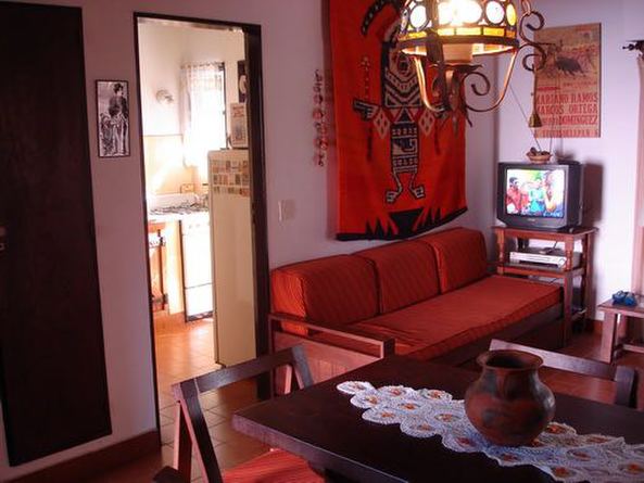 Departamento para cuatro personas con cochera, patio con parrilla y mesa en patio , lavadero, living comedor con sillon cama, dormitorio con cama de dos plazas, placard muy grande, todo amueblado en perfecto estado y equipado para cuatro personas, ideal familia.