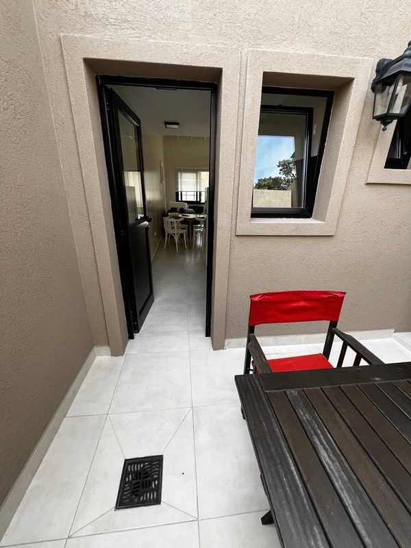 -salida desde la cocina a espacio exterior privado con parrilla y mesa con sillas