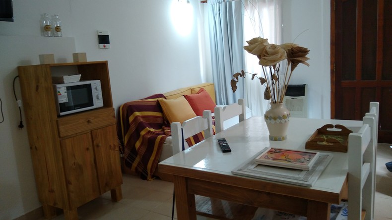 Sommier dos plazas, + Diván de 1 plaza ( dos camitas), mesa y 4 sillas, Smartv, microondas, heladera con freezer, ventilador, cocina a gas, estufa tiro balanceado, panel calefactor electrónico, termotanque a gas. 2 reposeras y 1 sombrilla para la playa