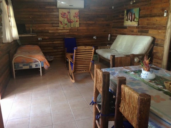 Cabaña para 6 personas. Totalmente equipada. Heladera, microondas, lavarropas automático, Tv, wifi, Direct Tv, pava electrica, calefon electrico, aires acondicionado, cama de dos plazas, camas cuchetas, parrilla propia, cochera cubierta. Baño completo.