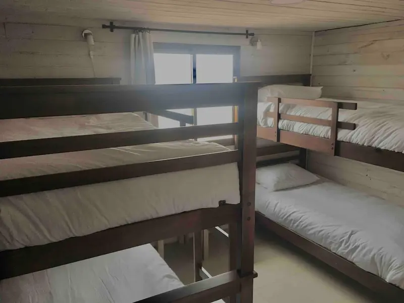•Tres piezas: la primera con cama matrimonial, la segunda con dos camas individuales y la tercera con dos camarotes, es decir, capacidad para 8 personas