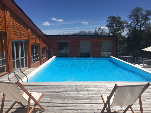 Se encuentra frente al lago Nauhel Huapí, sobre la ruta 40.