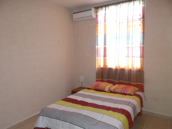 Recamara principal con cama matrimonial , aire acondicionado, ventilador, closet.