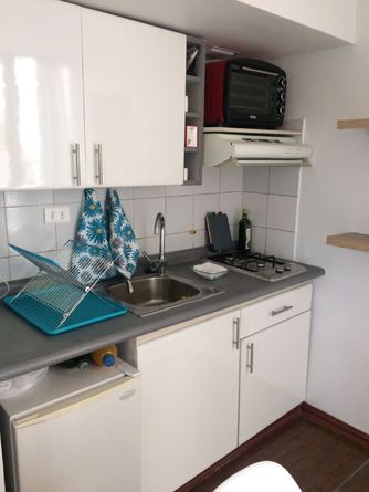 Terraza con pequeña parrilla eléctrica, vista al mar.