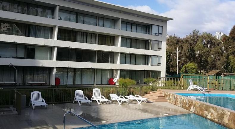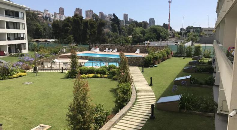 1 Dormitorio y 1 baño, un dormitorio en suite con cama matrimonial ,living con cocina americana , linda terraza,con piscina, estacionamiento, lavanderia y jardines,cerca de la playa y del centro de Reñaca.