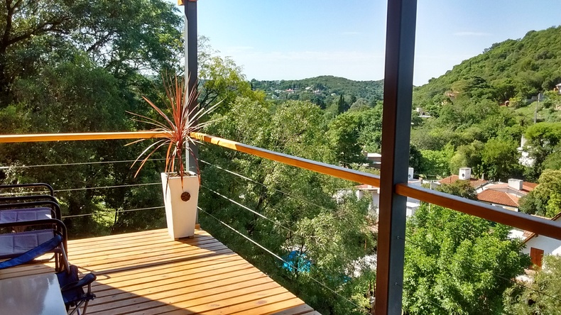 Equipada totalmente para alojar hasta 6 personas. Cuenta con: cocina equipada, baño completo con agua caliente, dos habitaciones con ventilador, pileta, asador, galería, cochera, deck con espectacular vista a las sierras, aire frío/calor, desayuno seco.