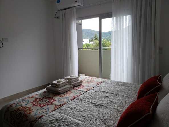 Hermoso y Amplio departamento de 1 dormitorio (54 m2) en edificio moderno. WIFI, smart TV led 49'". 2 Aires Acondicionados frio/calor. Cuenta con 2 balcones, uno al frente con vista a los cerros; otro al contrafrente del edificio con lavadero. 3 camas: una matrimonial en el dormitorio y 2 individuales en la zona del living. Completamente equipado: cocina, heladera con freezer, microondas, pava eléctrica, vajilla y utensilios para cocina. Plancha y tabla para planchar. Incluye ropa de cama y toallas. Situado en zona estratégica para acceder a los distintos puntos de interés de la ciudad. A metros de reconocida zona de bares y restaurantes. Normalmente se consigue estacionamiento gratuito fuera del edificio.