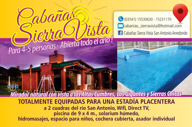 2 Cabañas para 4 personas ubicadas en San Antonio de Arredondo, Villa Carlos Paz , en el Valle de Punilla- Córdoba Están construidas en ladrillo vista, madera y piedra con detalles de calidad que lo harán sentirse como en su casa , pero en el medio de la naturaleza. Se encuentran a sólo 7 kms de Villa Carlos Paz rodeada de un entorno natural único y tranquilo . Poseen una inmejorable vista a las altas cumbres ( camino a Mina Clavero ) y a las sierras chicas. Están ubicadas a sólo 200 metros del Río San Antonio de frondosa vegetación con aguas cálidas y transparentes. Si lo que Ud busca es un lugar cálido , tranquilo y rodeado de verde y naturaleza , " Este es el lugar ".