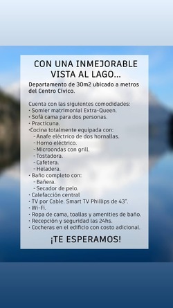 Con una inmejorable vista al lago y ubicado a mts del Centro Cívico, nuestro departamento de 30 m2 cuenta con las siguientes características y comodidades:
